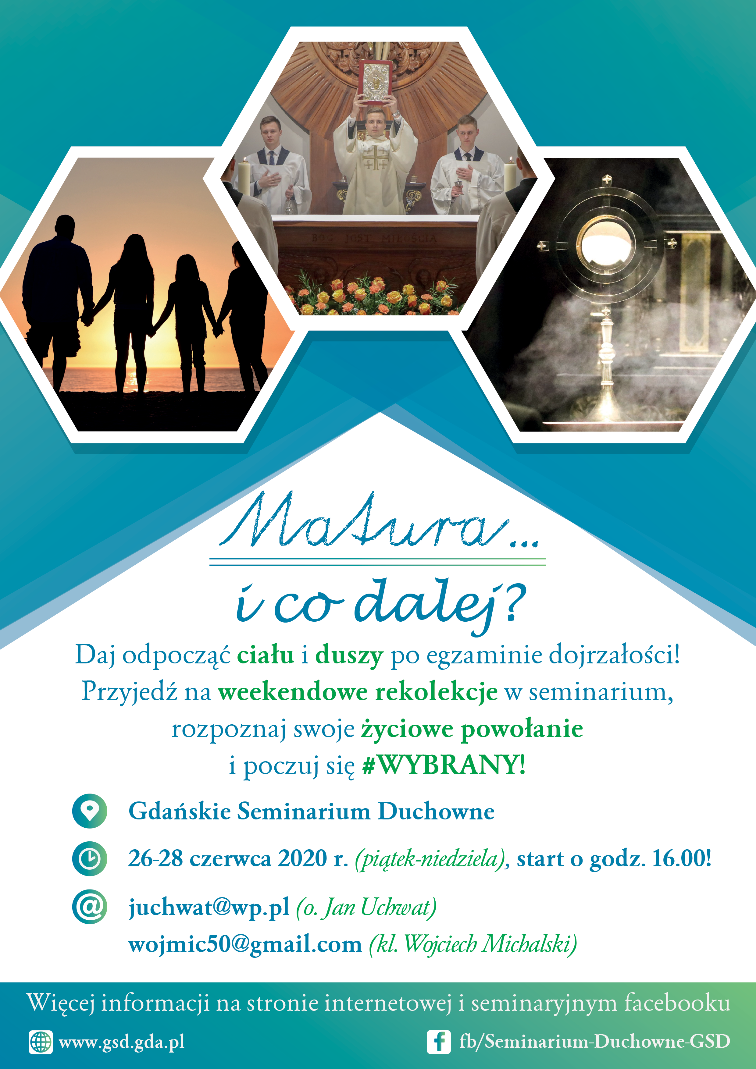 Gdańskie Seminarium Duchowne w dniach 26 – 28 czerwca 2020 r. organizuje dni skupienia dla maturzystów i studentów pod hasłem „Matura… i co dalej?”.