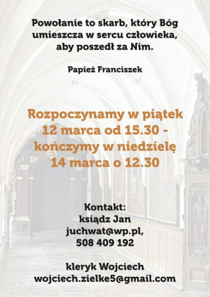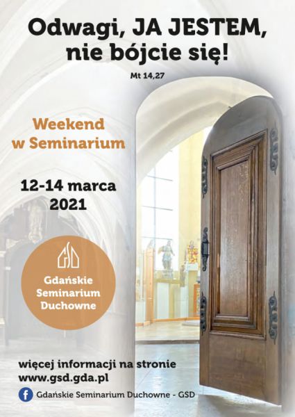 Gdańskie Seminarium Duchowne w dniach 12-14 marca 2021 r. organizuje tzw. „Weekend w Seminarium”, czyli dni skupienia dla młodzieży męskiej, zwłaszcza dla starszych członków Liturgicznej Służby Ołtarza (szkoła średnia, studenci), pod hasłem „Odwagi, Ja jestem, nie bójcie się!” (Mt 14,27). Razem z klerykami przez 3 dni będą mogli żyć zgodnie z planem dnia obowiązującym w Seminarium. Program znajduje się poniżej.